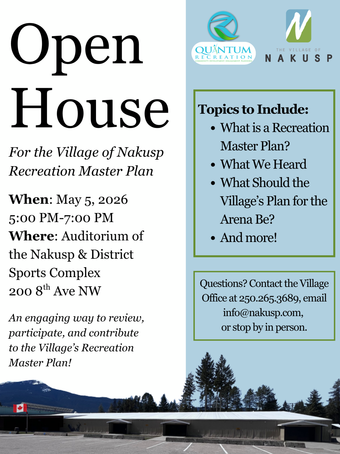 For more information about the Recreation Master Plan or upcoming engagement events, please contact the Village Office at 250.265.3689 or info@nakusp.com.