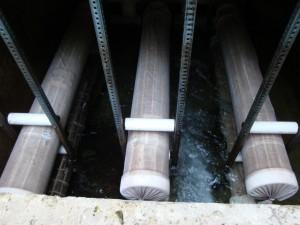 Surface water undergoes coarse filtration in the filter sock chamber, which houses six perforated PVC  pipes covered with mesh filter media (socks).  Each pipe is approximately 12” in diameter and 8’ long. Coarse filtration removes large debris, such as leaves, sticks, pine needles, frogs, etc. These filter socks can become clogged, especially during the freshet, and require constant monitoring and cleaning. Coarse filtration is not technically considered part of the water treatment process because fine materials and micro-organisms are not removed.